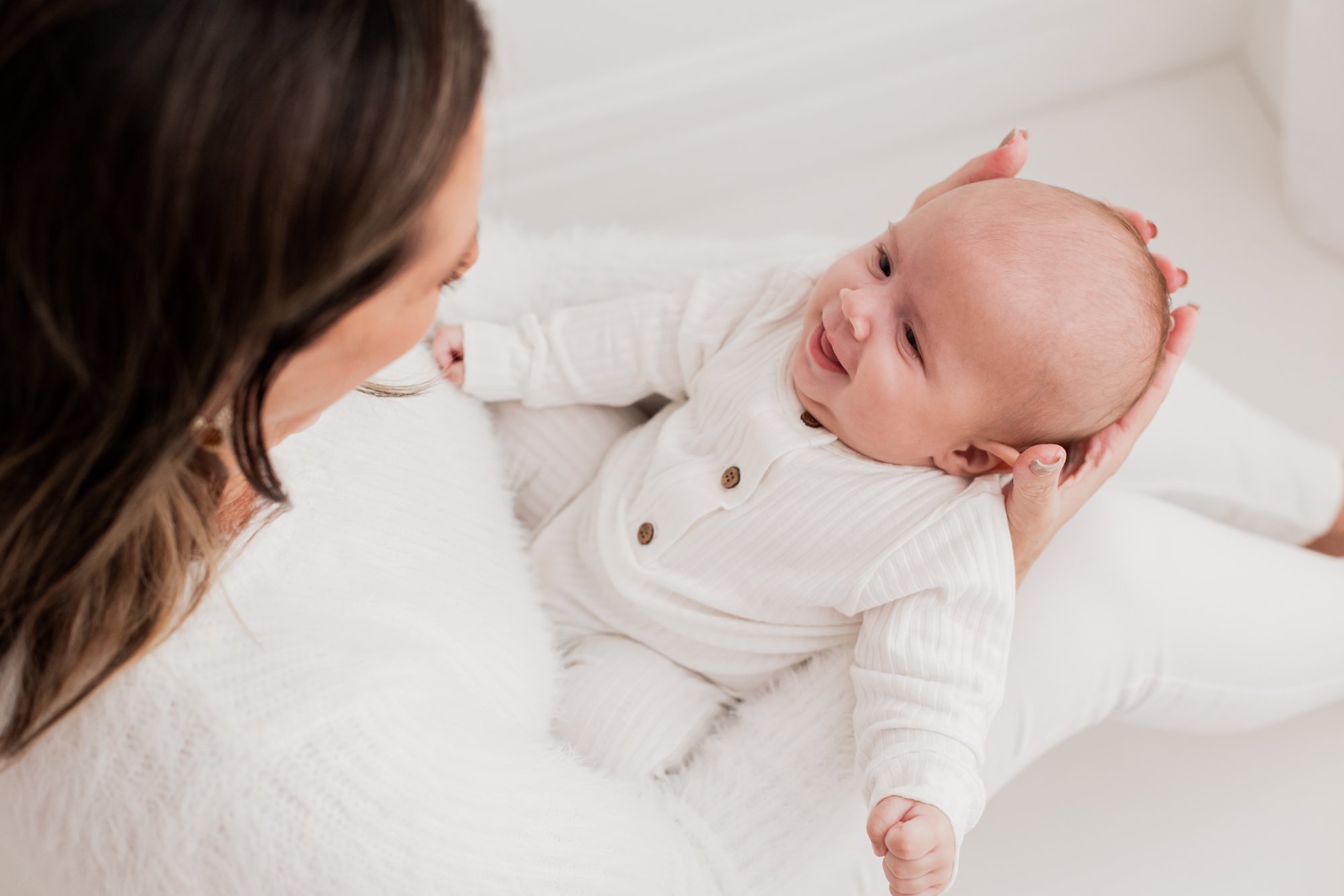 O bebe ja interage, sorri e segura a cabeca. E uma fase linda para fotos com a mae.