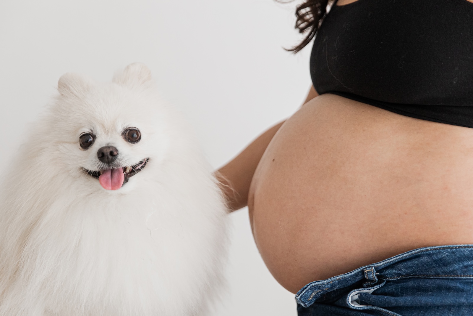 Nosso estúdio é pet-friendly certificado, então se você quiser incluir o cachorro ou gato da família no ensaio gestante, é totalmente possível — e fica lindo.