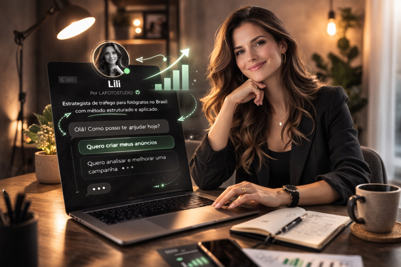 A Lili é uma estrategista de tráfego pago criada exclusivamente para fotógrafos brasileiros. Diferente de cursos genéricos ou gestores de tráfego que cobram mensalidade, a Lili orienta você passo a passo para criar anúncios no Meta Ads (Instagram e Facebook) com segurança. Assinatura mensal de R$99,90, sem contrato — cancele quando quiser. Ideal para fotógrafos de ensaio, newborn, gestante, casamento e outros nichos que querem parar de depender apenas de indicação.